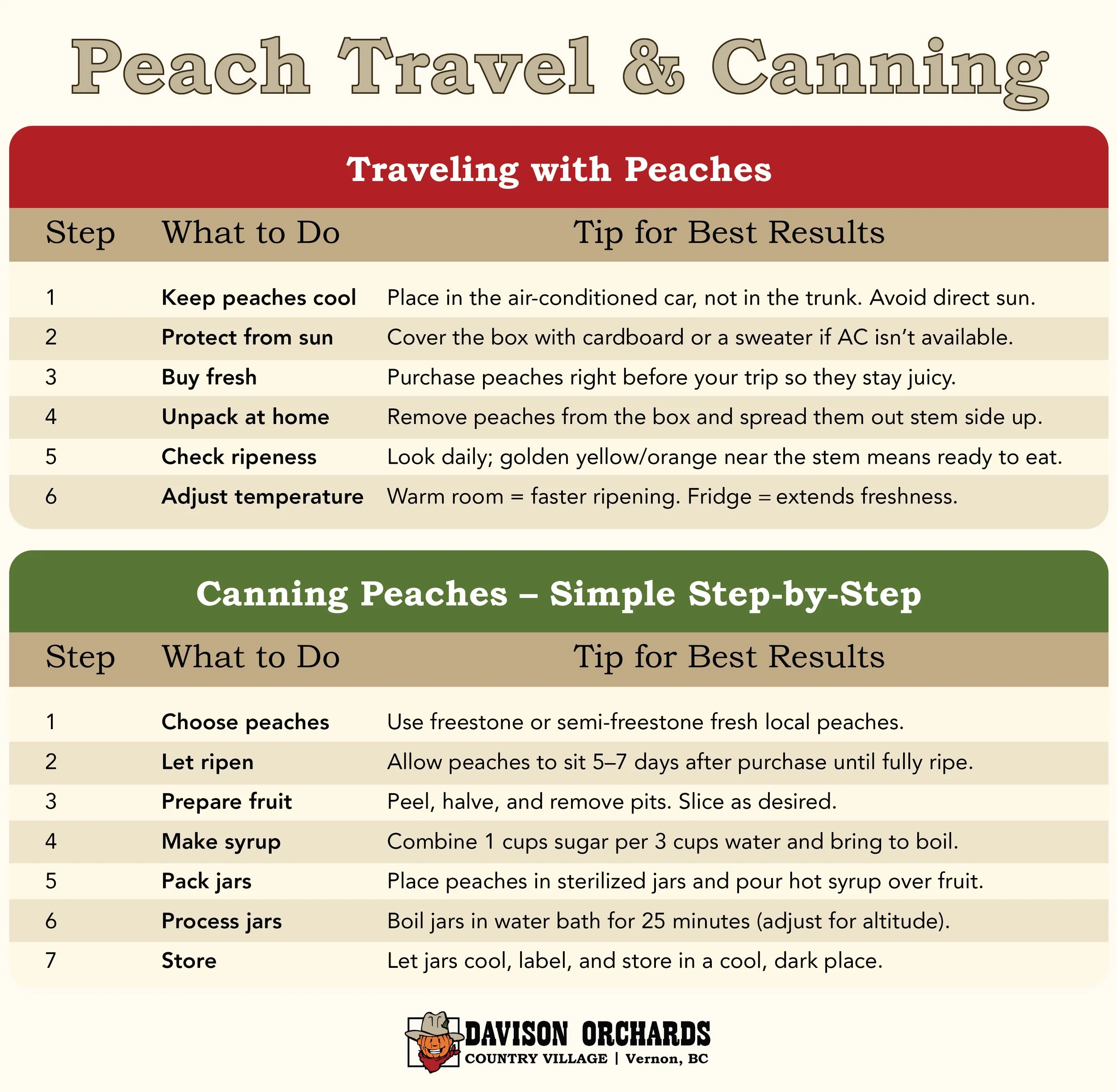 Peaches require a little TLC (Tender Loving Care), but the results are amazing. Well-ripened peaches are juicy, fragrant, and sweet, a true taste of summer in Vernon, BC! Following these tips lets locals and visitors enjoy the best fresh orchard peaches from Davison Orchards and make the most of their Okanagan farm experience.