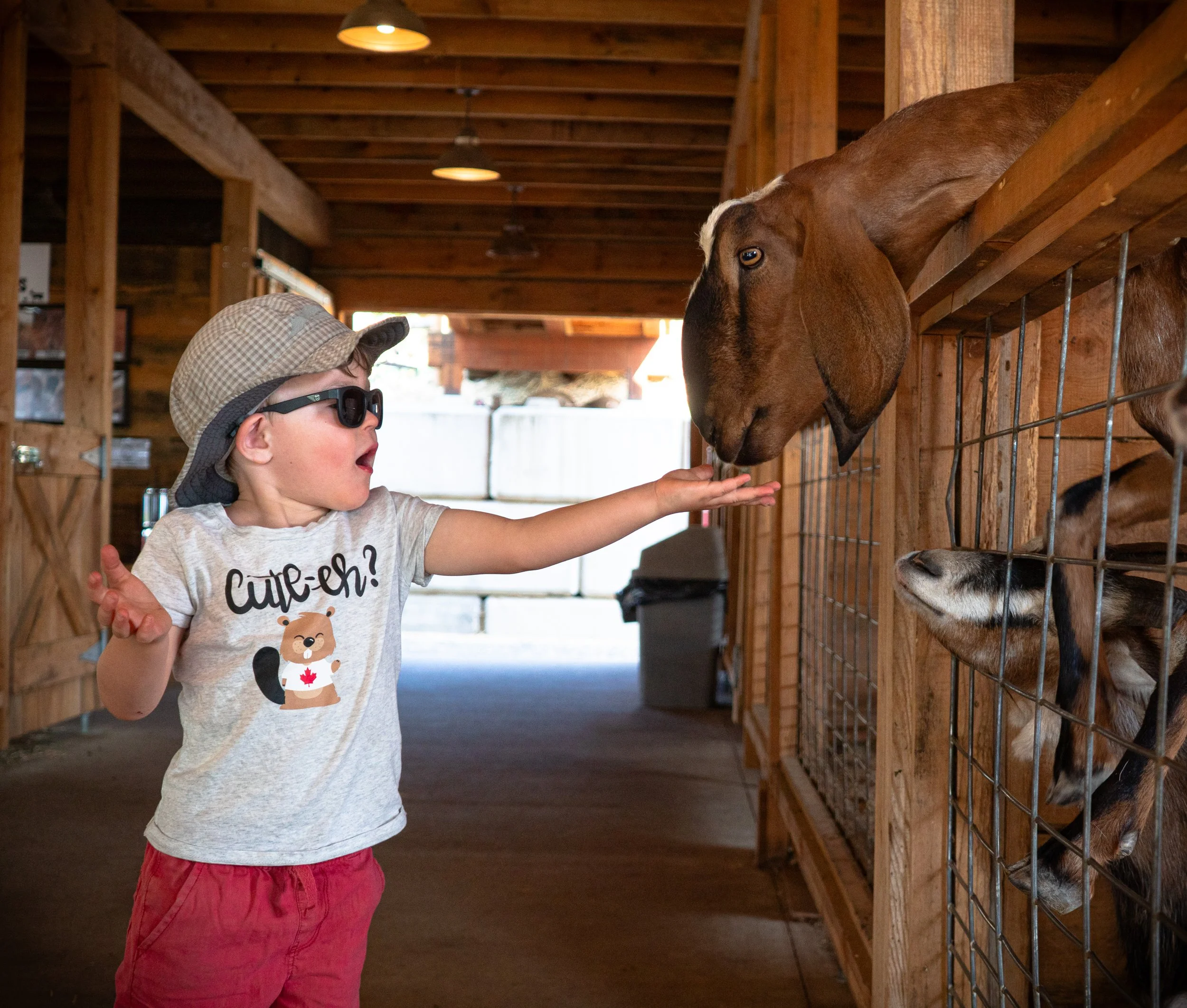 Come and visit the friendly farm animals at Davison Orchards in Vernon, BC! Interact with our goats, sheep, chickens, turkeys, and donkeys in and around the big log barn. The Animal Barn is free to visit, open during market hours, and is a safe, family-friendly space where kids – and the young at heart – can enjoy hands-on farm fun. Want to experience feeding the animals? Bring quarters to buy animal feed for an extra interactive experience.